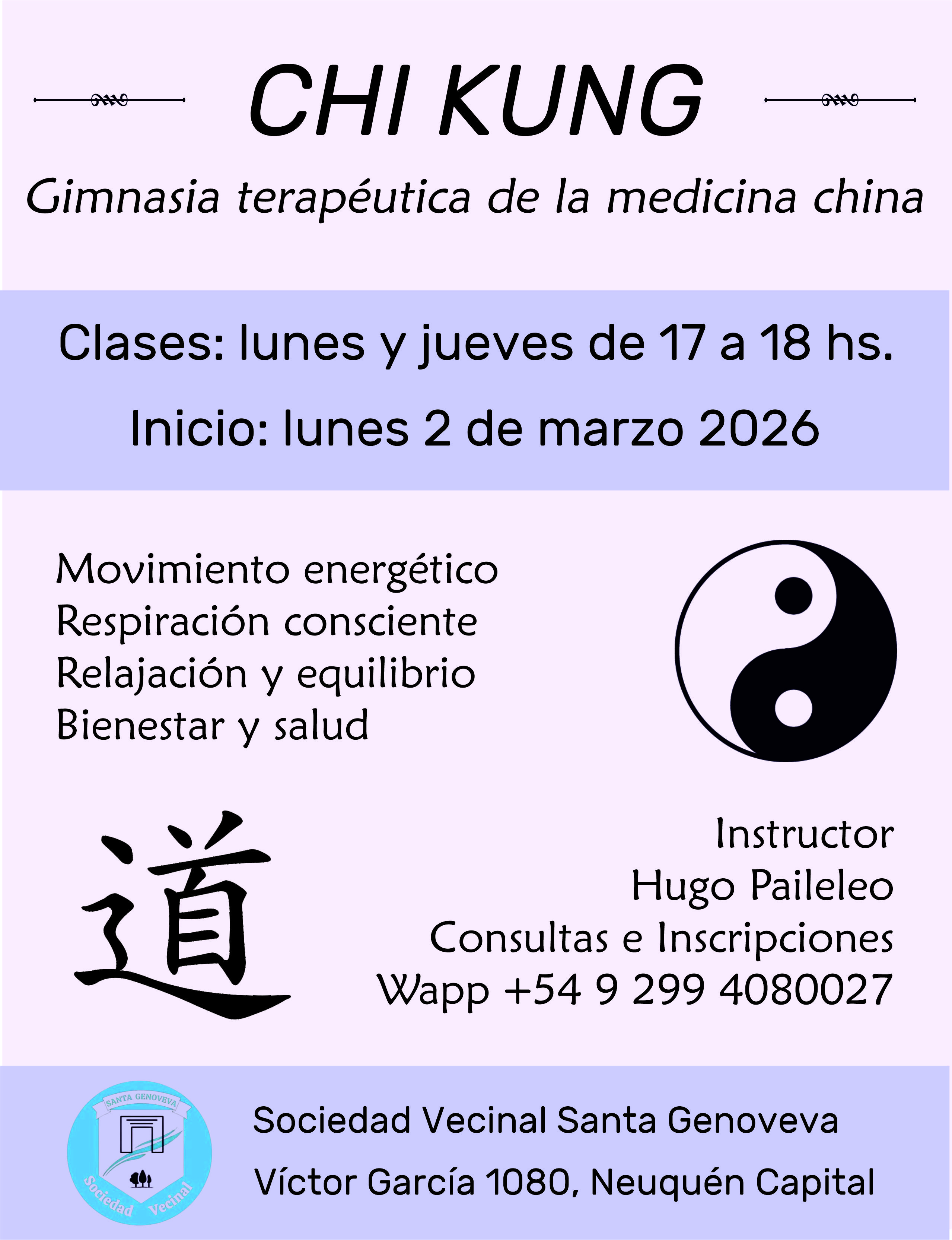Instructor certificado por la Escuela Superior Wudao (España) y Tao de Armonía (Argentina) para el dictado de clases y talleres de Chi Kung (CK) y Tai Chi Chuan (TCC).